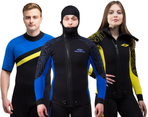- гидрокостюмы собственного производства, изготовленные из различных материалов (нейлон, ультраспан, резина «открытая пора») и в широком диапазоне толщины – от 3 до 10 мм. Крой выполнен таким образом, чтобы специальная одежда плотно прилегала к телу и не сковывала движений пловца;